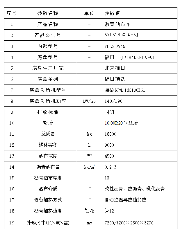 2、YLLS0945(國Ⅵ 標配型)全自動瀝青灑布車技術參數